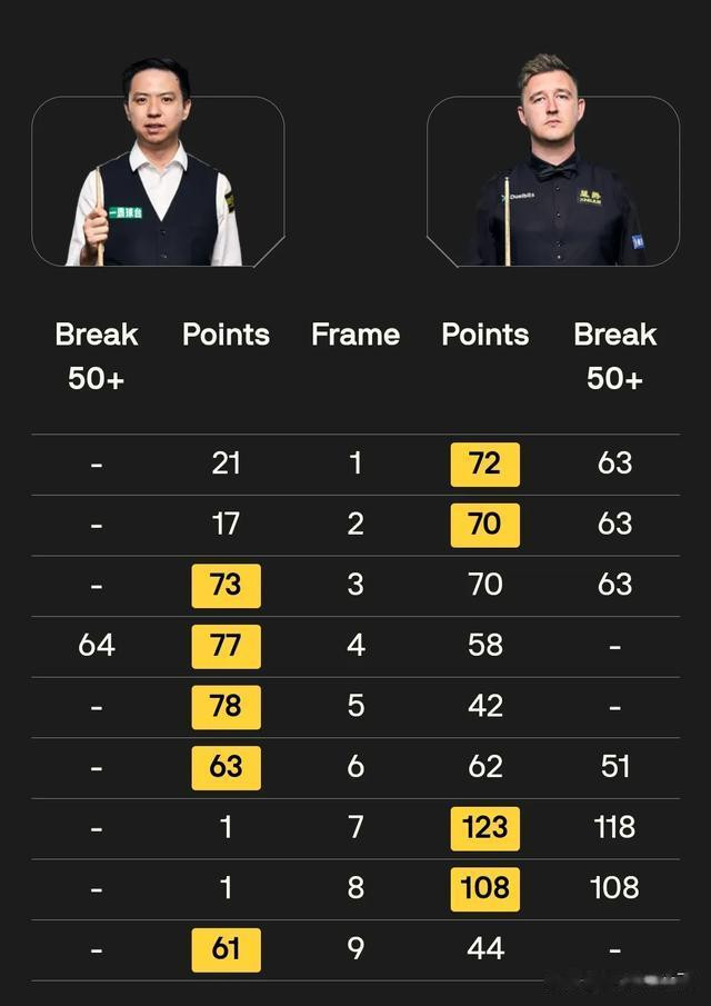 两边交战纪录也格外悬殊,肖国栋仅获取4胜11负,不外,两东谈主最近的一次比赛是在2024年武汉公开赛第3轮,那场比赛很邪门,阿囧哥全场轰出4杆50+和贯穿2杆破百,到临了如故为山止篑,以总比分4-5输给了只打出1杆50+高分的肖国栋,后者临了踩着威尔逊的肩膀,终于加冕管事生计名次赛首冠。