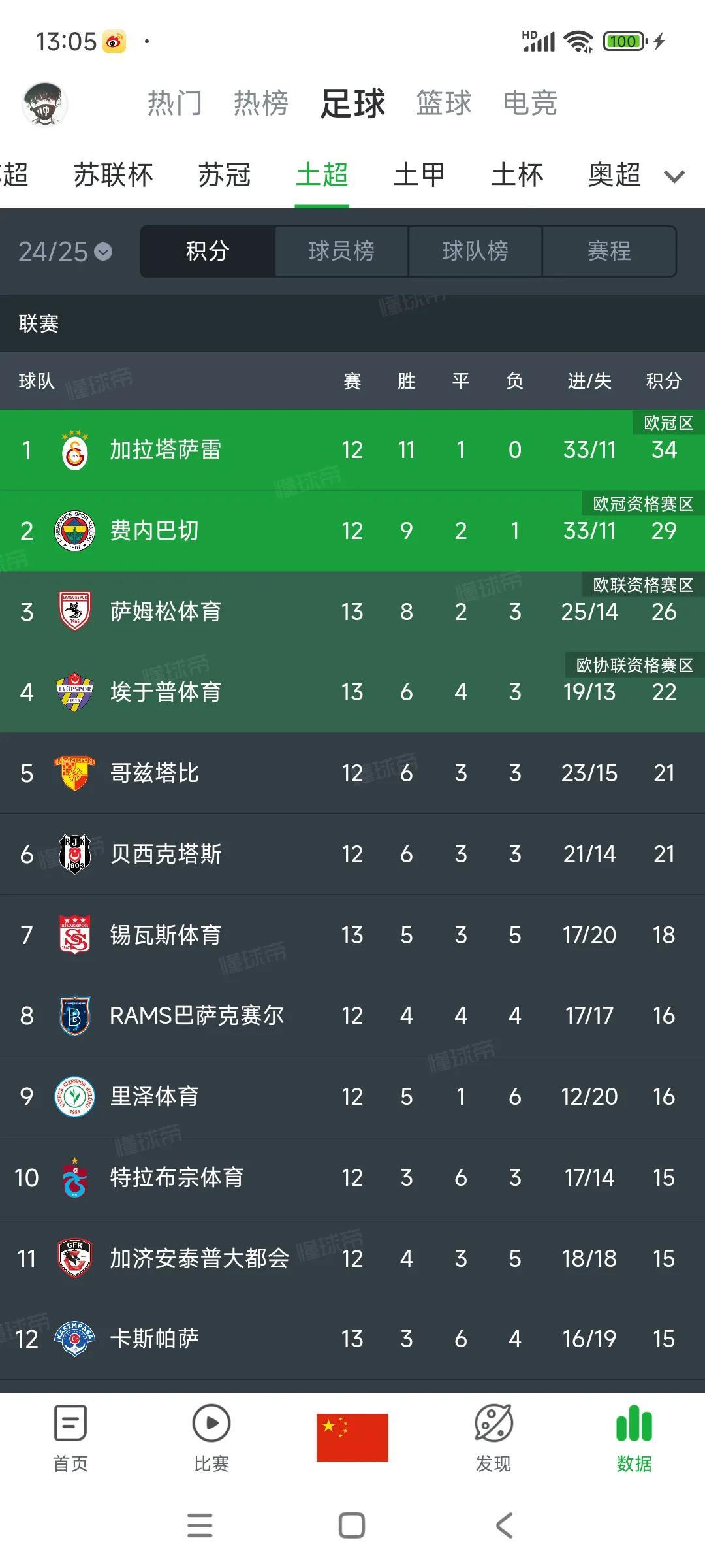 土超第一加拉塔萨雷太好坏,上赛季102分夺冠,费内巴切99分唯一亚军。