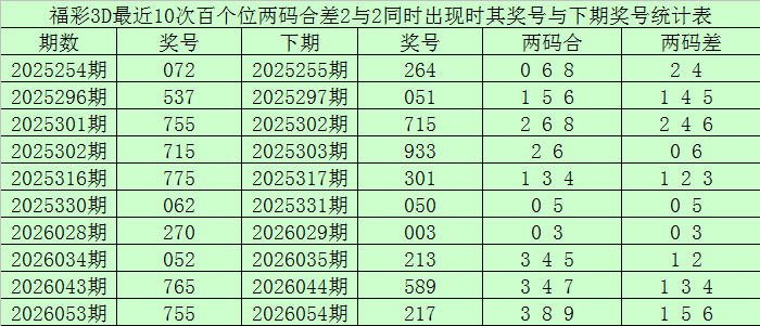 从以上统计不错看出,百个位两码合差2与2同期出现之后其下期两码合差发扬最热的4个阔别为:1235,本期百个位两码合差不错参考这四码中的数据。
